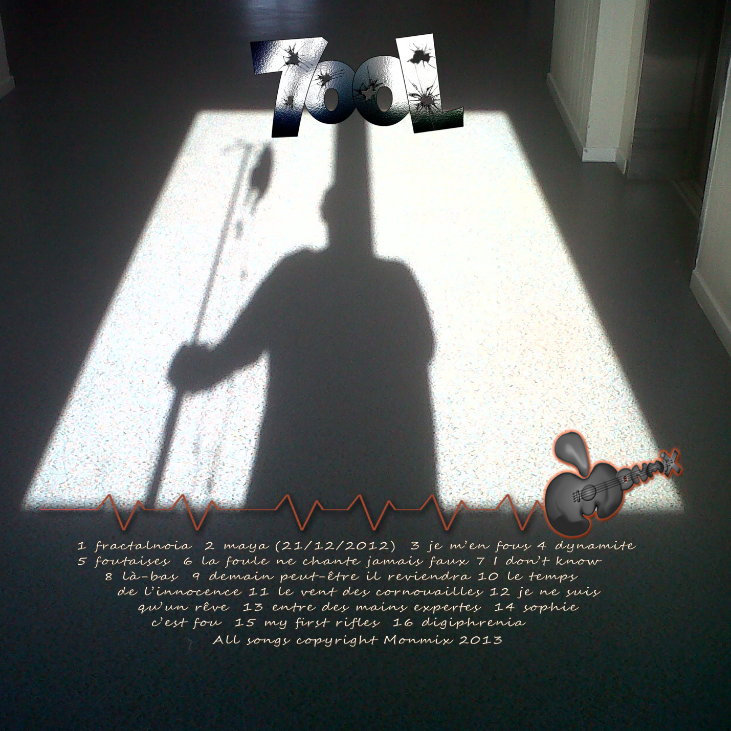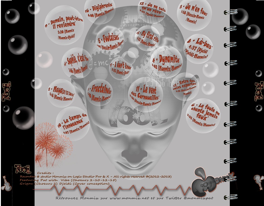 A noter que la pochette recto est basée sur l'ombre de Monmixpat sur le sol lors d'un séjour à l'hopital avec son support de perfusion (séjour sans gravité, que les fans se rassurent!). La réalisation de la pochette est comme souvent le fruit du travail de Djeldi à qui l'on doit aussi ce superbe logo 7ooL que Monmix adore.