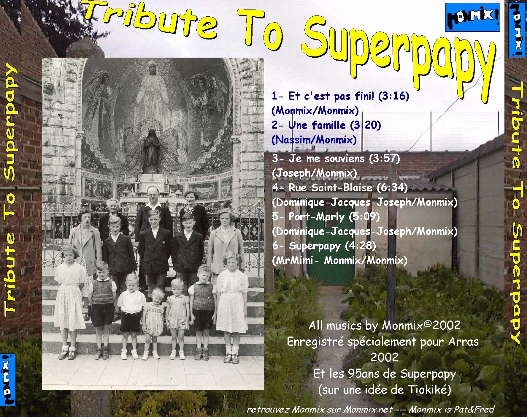 Confirmant sa decision de vous offrir l'integrale, Monmix vous livre aussi cet album concu pour la famille de Monmix. Un theme et but tres specifiques qui differe sensiblement du style Monmix pur. D'abord en 2002, anticipant légèrement les 95 ans de Superpapy, sur une idée de Tiokiké, Monmix s'est lancé dans l'écriture ultra rapide, mais non bâclée de 6 chansons. Aidé des idées des Dominique, Jacques, Joseph et Nassim, les souvenirs communs sont égrenés au gré de mélodies qui s'y prêtent tout particulièrement. La chanson Superpapy, créée 5 ans plus tôt, trouve maintenant clairement sa place au sein de ce disque. Arras fut aussi le théâtre d'un concert Live de Monmix pour ce Tribute To Superpapy 15 ans et plein d'enfants plus tard, une mise à jour de "Et c'est pas fini" se justifiait